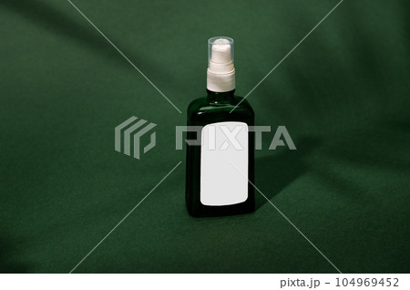 Dark glass bottle with white label with cosmetic product, shot with shadow from a palm leaf falling on green background