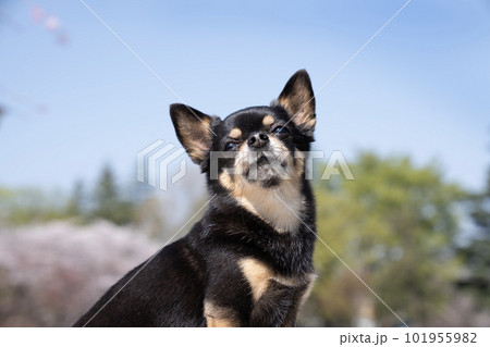 桜と青空とチワワのバストアップ