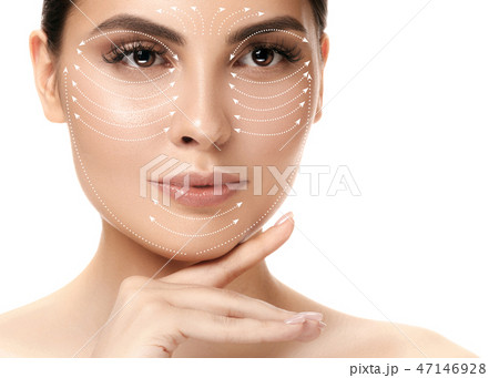 Close-up portrait of young, beautiful and healthy woman with arrows on her face