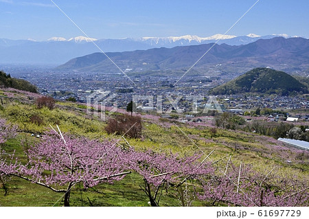 花咲く桃とプラム畑に甲州市街地と南アルプス