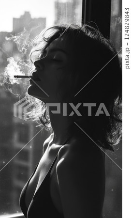 Cinematic noir photograph of a woman smoking by a window, smoke swirling gently, with shadows on her face and the city skyline in the background, evoking a contemplative mood
