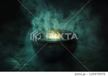 Cauldron boiling with dark smoke and flames in a mystical setting at night
