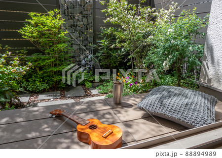 縁側の陽だまりでウクレレを楽しむ ガビオン(蛇籠)のある小さな庭で