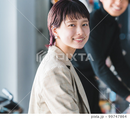 立って打ち合わせ_明るく笑うクリエイター女性1