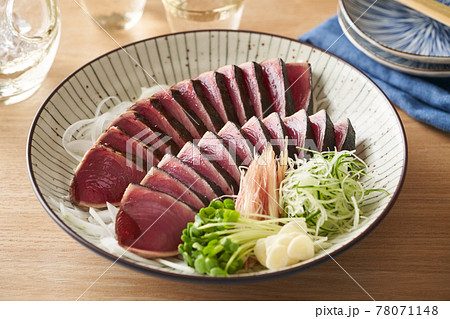 大皿に盛り付けた鰹のたたき