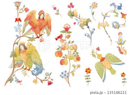 Whimsical designer watercolor illustration set inspired by Slavic mythology, featuring the mythical Alkonost bird, floral ornaments and folk elements. Ethnic folklore art ideal for fairytale design