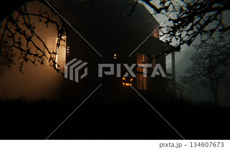 Spooky Halloween night with a glowing jack-o'-lantern on the porch of an old house surrounded by dark trees and mist. Mysterious haunted atmosphere perfect for horror and autumn themes.
