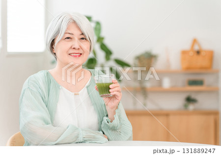 健康のため青汁・グリーンスムージー・野菜ジュースを飲むシニア女性