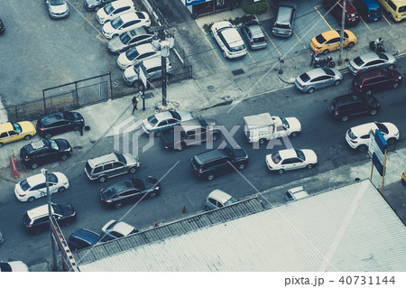 Above view of wide highway crossroads in Miami, Florida with slow driving cars during rush hour. USA transportation infrastructure concept