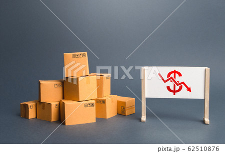 Pile of boxes and easel with red dollar arrow down chart. Drop profits, sales slowdown. Decrease in trade volumes, commodity prices. Unprofitable business, adverse conditions for production investment