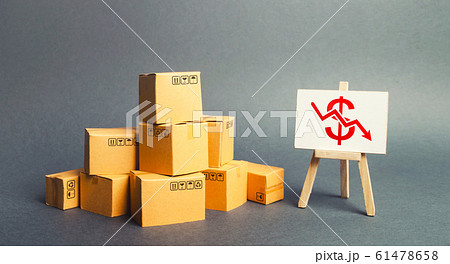 Pile of boxes and easel with dollar red arrow down graph chart. Drop in profits, slowdown in sales. Fall in imports or exports, trade deficit. Low productivity and high costs. Industrial production.