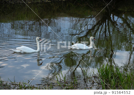Two Graceful white Swans swimming in the lake, swans in the wild