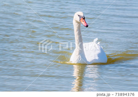 Graceful white Swan swimming in the lake, swans in the wild. Portrait of a white swan swimming on a lake.