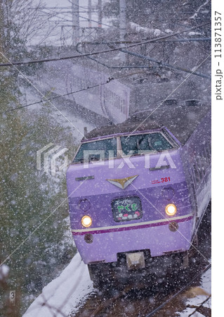 法面に雪の積もった土手を駆け抜ける復刻版スーパーやくも色の381系特急やくも号