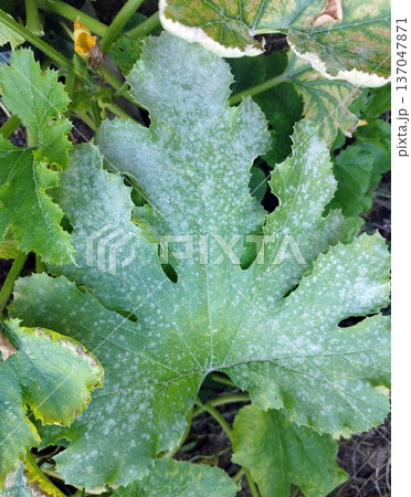 Close-up of a large, green squash or zucchini leaf heavily afflicted by powdery mildew, showing white, dusty spots and surrounding healthy foliage