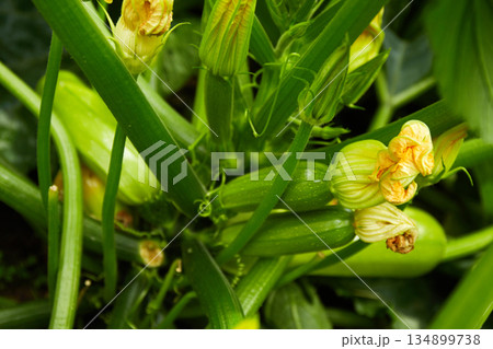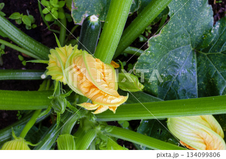 Young zucchini grows in the garden. Organic vegetable garden