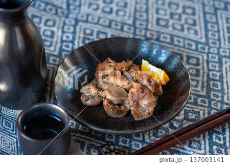 鶏砂肝(ズリ)の塩焼き。(スキレットに入れられた状態。)