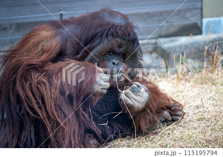 藁を食べるオランウータン