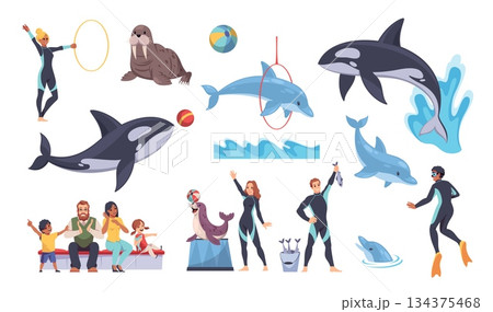 Dolphinarium elements. Funny marine animals and people, visitors and trainers, killer whales, walrus, seal for performances, mammal jump, play with hoop and ball cartoon flat tidy vector set