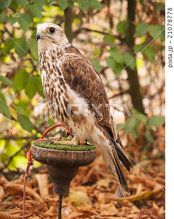 The Saker Falcon (Falco cherrug), stands on a stand in the garden
