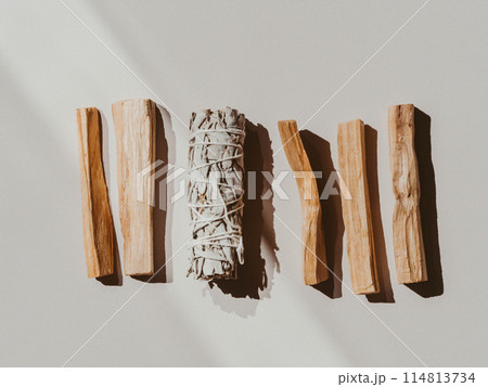 White sage and Palo Santo on a light beige background. A set of incense for fumigation