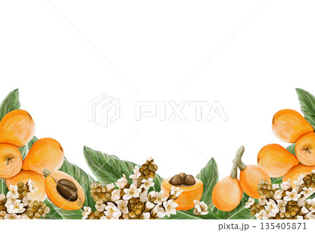 A frame with medlar fruits. Tropical flowers. Inflorescences with small white petals and buds. Juicy orange plums. Watercolor illustration without background. Hand-drawn. High quality illustration