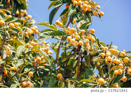 Eriobotrya japonica tree (medlar) with ripe orange fruits against blue sky