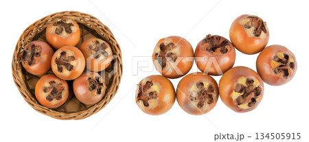 Brown fresh medlars isolated on white background. Mespilus germanica . Top view. Flat lay