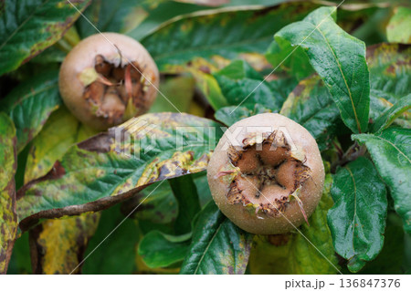 Rare medlar fruit growing on tree in autumn