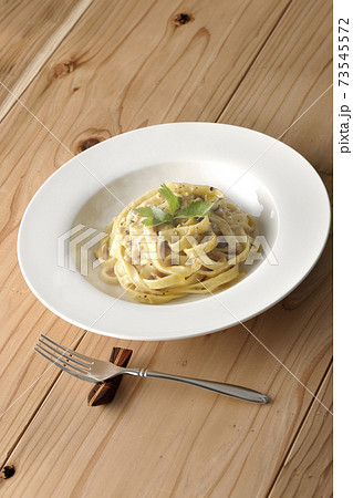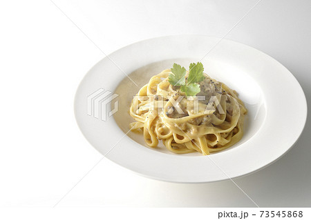 三つ葉が乗っている熱々トリュフクリームの平打ちパスタを白背景で撮影
