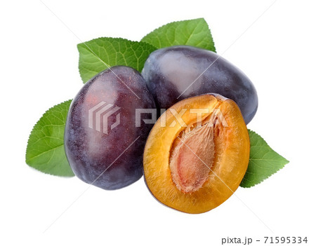 fresh purple plum and half with leaves isolated on white background with clipping path and full depth of field. Set or collection