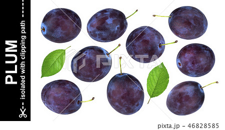 AI-generated content. Plum with leaf isolated on white background, top view, AI generated