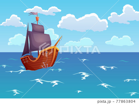 Pirate wooden ship in ocean. Advertising of tropical sea landscape with antique sailboat. Solitude yacht dissecting sea waves