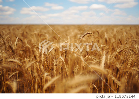 Golden spikelets of wheat in the field at sunset. Agricultural concept. Harvest nature growth.