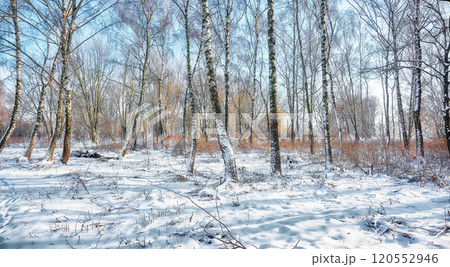 Astonishing landscape with snow-covered birch trees and grass in the city park.