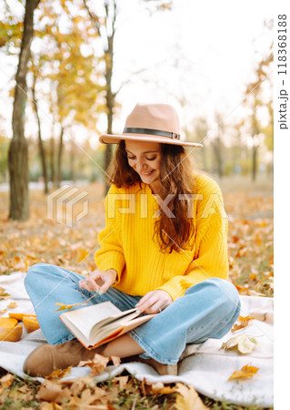 Fall picnic with pumpkin. Stylish woman enjoying autumn weather in the park. Autumn harvest.