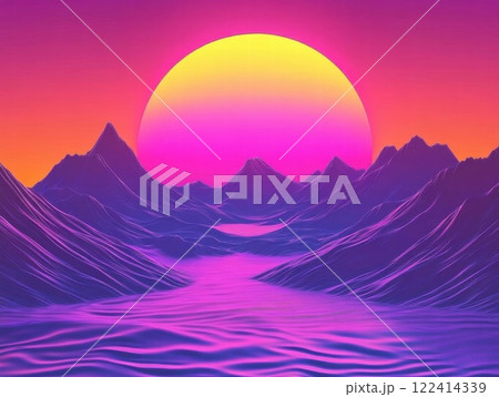 Abstract Geometric Landscape with Stylized Mountains and Vibrant Sun Over Calm Water Surface