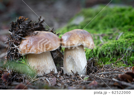 Two porcini mushrooms growing in pine tree forest at autumn season..