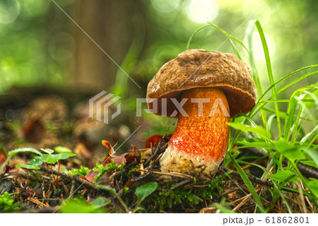 Wild cep mushroom growing in a green forest during daylight with beautiful bokeh background
