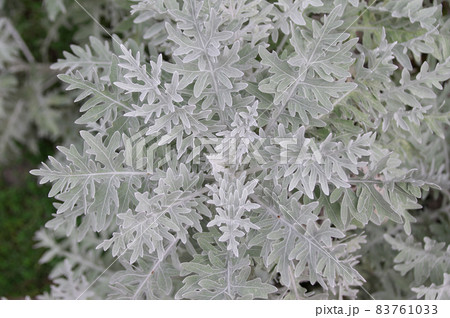 春の庭に育つシロタエギクの葉と花の小さなつぼみ
