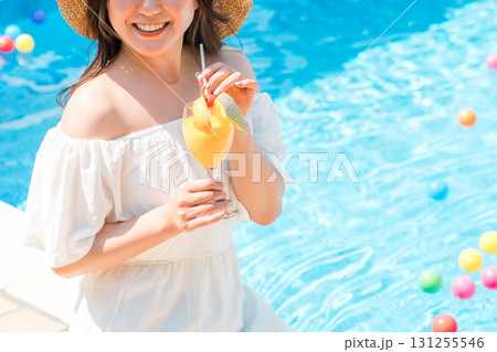 プールサイドでトロピカルジュースを飲む若いアジア人女性(リゾート・バカンス・バケーション)