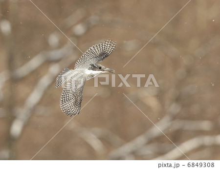 雪の日、二匹の魚を捉えて止まり木に止まろうとするヤマセミ