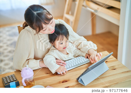赤ちゃんを抱えてパソコンを操作する女性