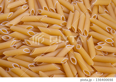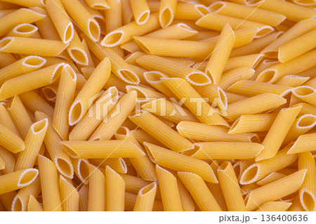Close view of uncooked penne showcasing its rough ridged tubes, Detailed photograph of uncooked penne pasta with textured ridges for packaging and branding uses