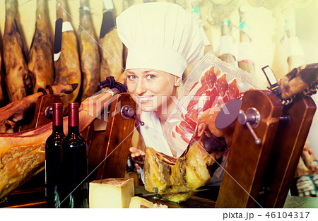 Portrait of mature shop man offering Spanish jamon