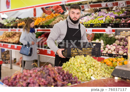 Man seller moving box of bananas in grocery shop