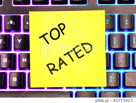 top rated text written on a yellow sticker lies on a glowing keyboard