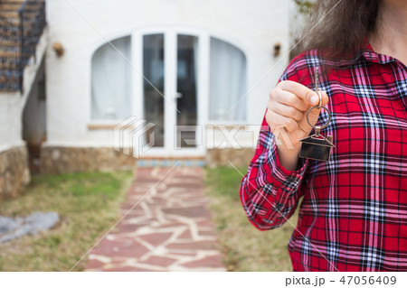 Woman holding key with a keychain in the shape of the house. House key on background of new home