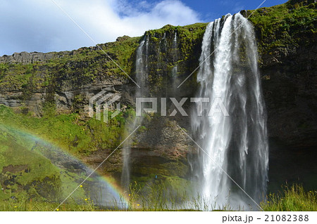 夏のアイスランド セリャランスフォスの滝と虹(Seljalandsfoss )