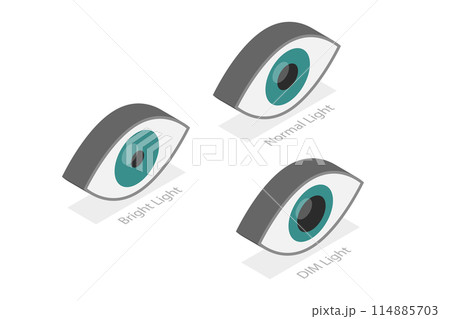 3D Isometric Flat Illustration of Pupillary Light Reflex, PLR, Three Different Variations